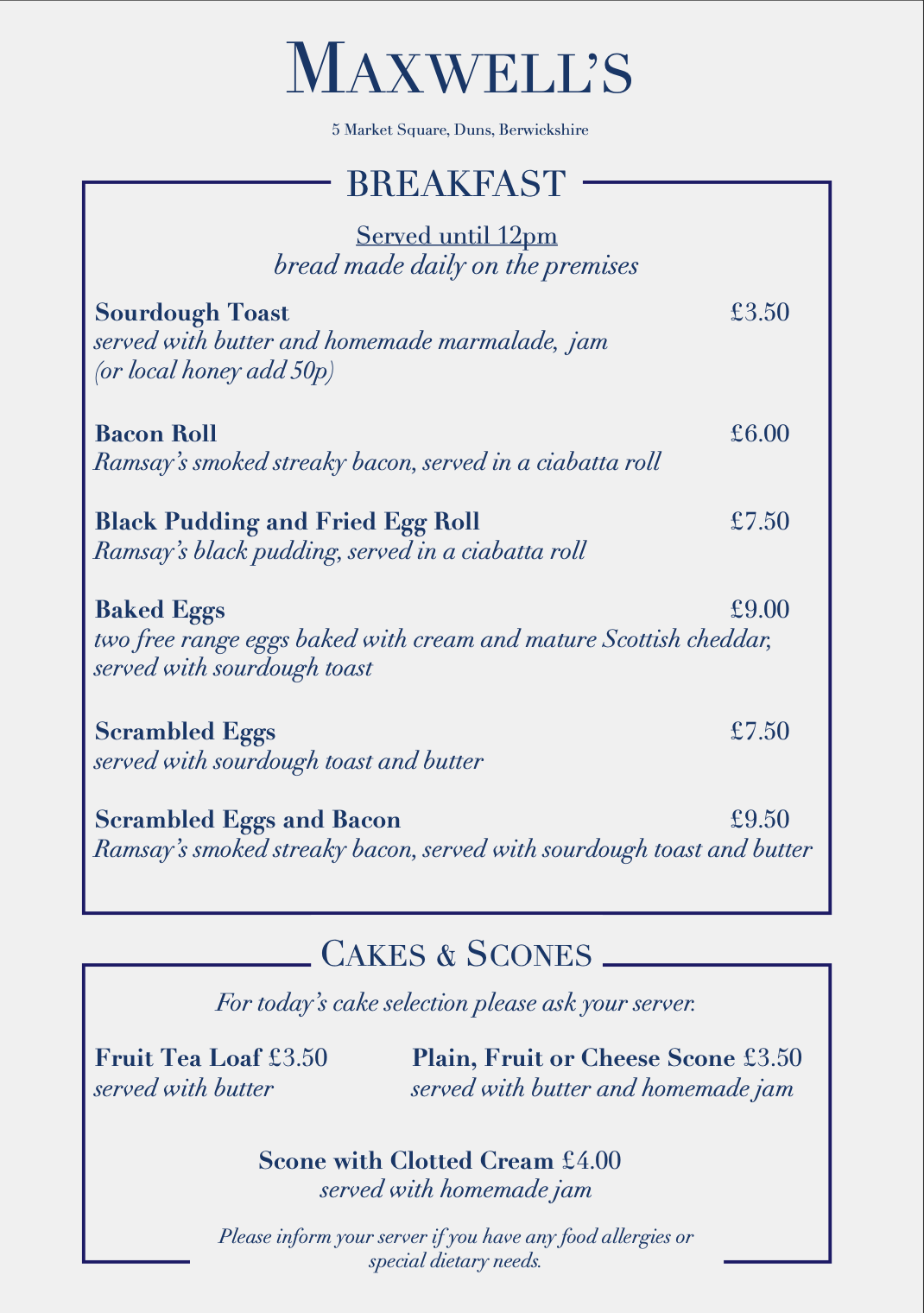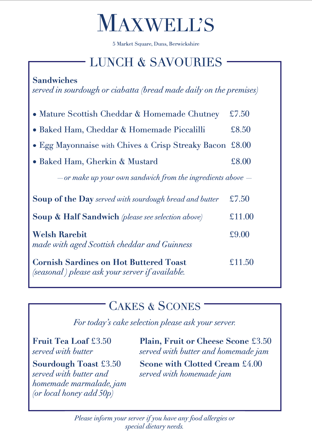 The menu at Maxwell’s is small but perfectly formed. Everything on the menu at Maxwell’s is made on the premises. Our aim is to keep things simple but get them right. The soups and specials and cakes change with the seasons so there is something new on the menu everyday.